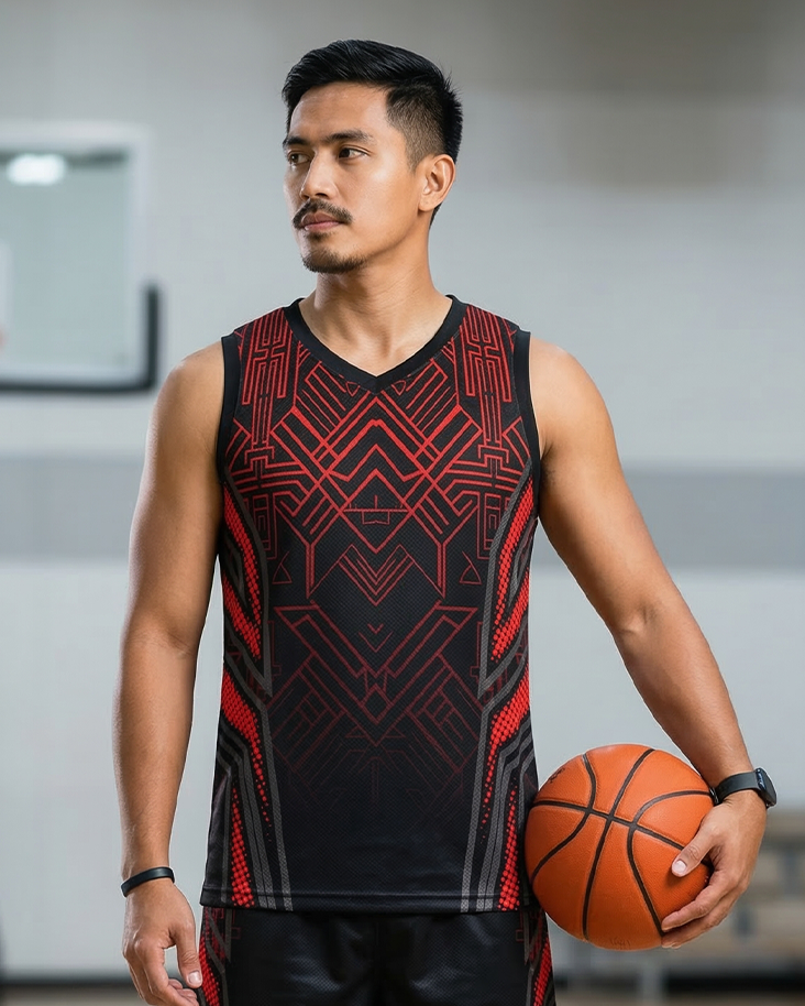 Designed for teams that refuse to blend in, this premium all-over print (AOP) uniform fuses ancient tribal geometry with futuristic tech elements. The striking, symmetrical design features a deep black base that allows the blood-red line work and aggressive halftone dot fades to truly pop. The chest is dominated by an intricate, maze-like pattern of sharp angles and circuit-inspired details that give your players an imposing, mechanized presence.