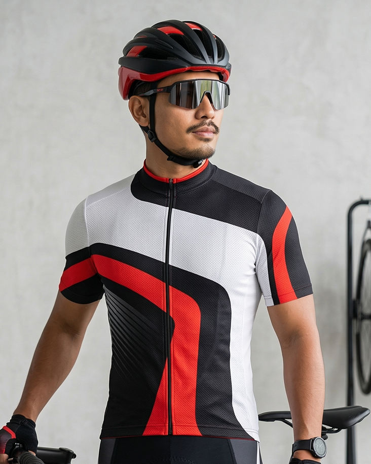Master the art of the overtake with the Kinetic Shift Jersey by SNF Sports Connect. This design focuses on fluid agility, utilizing sweeping, asymmetrical curves that create an unmistakable sense of motion and technical prowess. The striking interplay of crisp white, deep black, and aggressive crimson creates a high-stakes visual impact, further enhanced by a fading diagonal "speed-line" texture that wraps around the torso. Designed for cyclists who demand both style and engineering excellence, the Kinetic Shift offers a sharp, aerodynamic appearance that commands respect from the start line to the finish line.
