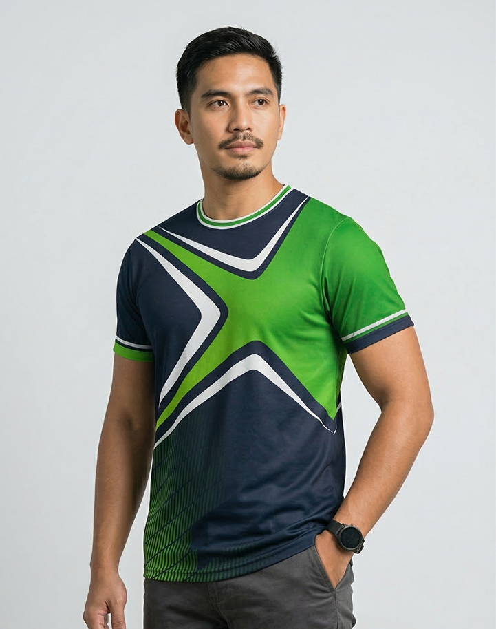 Designed for teams that refuse to blend in, this premium all-over print (AOP) uniform fuses explosive speed with sharp, modern aesthetics. The bold asymmetrical design features a deep navy base that allows the vibrant green and crisp white piping to truly pop. Across the chest, a massive, intersecting kinetic "X" acts as a powerful focal point, while sleek linear gradients at the bottom hem convey unstoppable forward momentum.